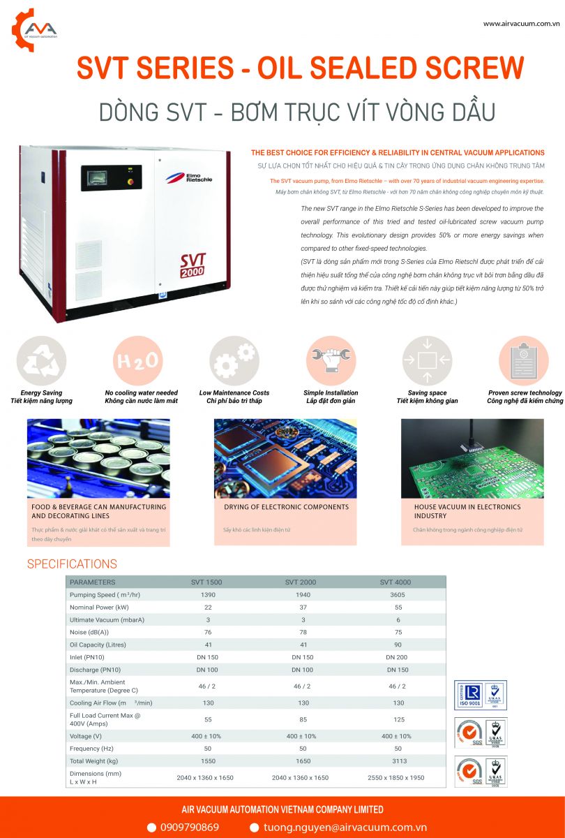 SVT là dòng sản phẩm mới trong S-Series của Elmo Rietschl được phát triển để cải thiện hiệu suất tổng thể của công nghệ bơm chân không trục vít bôi trơn bằng dầu đã được thử nghiệm và kiểm tra. Thiết kế cải tiến này giúp tiết kiệm năng lượng từ 50% trở lên khi so sánh với các công nghệ tốc độ cố định khác.